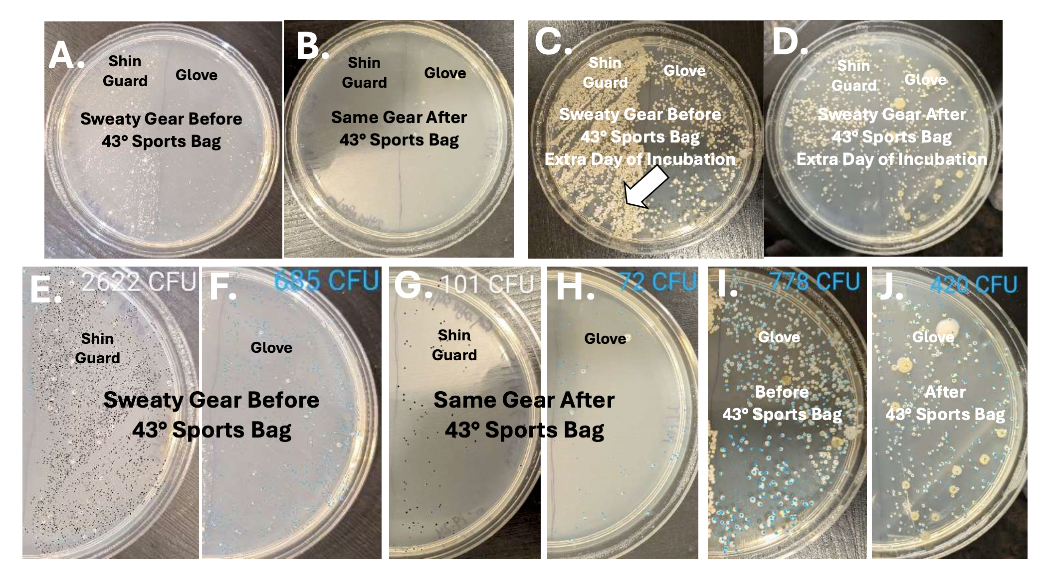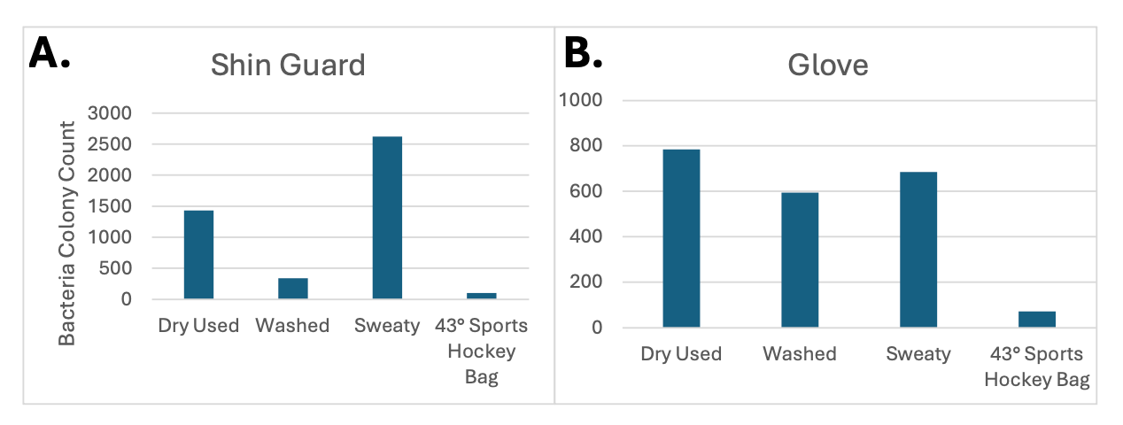 An independent study conducted by David A. Narvaiz, PhD examined bacterial growth in hockey equipment and evaluated how effectively the 43° Sports Temperature Controlled Hockey Bag reduced bacteria compared to traditional cleaning and drying methods.
