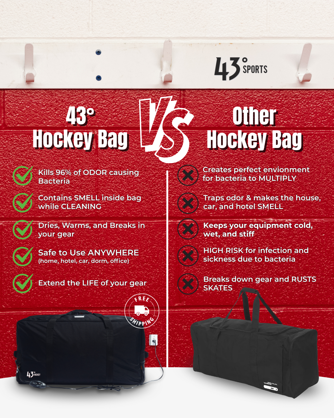 The 43° Hockey Bag is not a dryer. It is a temperature and humidity controlled sanitizing system designed specifically for hockey equipment. Sanitize, dry, preheat, and always have clean, dry gear that is ready to perform at it's best.